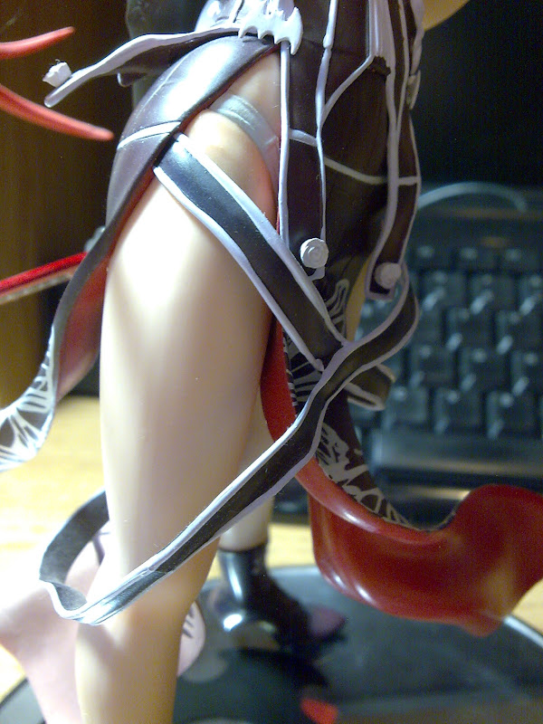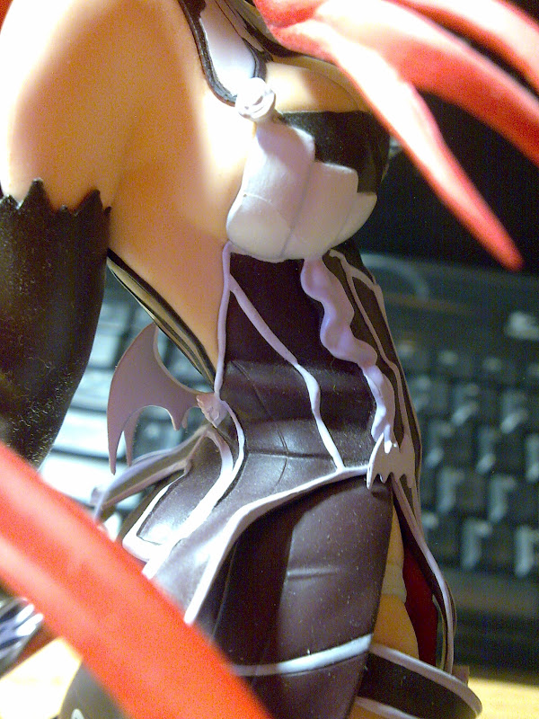 Working up, the torso too has plenty of detail. While in the pictures it may seem flat, every white lining is an extra surface and even the bats near her waist stick out. Small white rosebuds accent the ends of certain pieces of cloth. At her back another batwing design sticks out. I am not too sure why Ignis has such an affinity with bats. A firm outline of her buttocks add an extra level of sexiness alongside her ample breasts. Near her neck, the ribbon at the collar also sticks out as if was flowing in the wind.