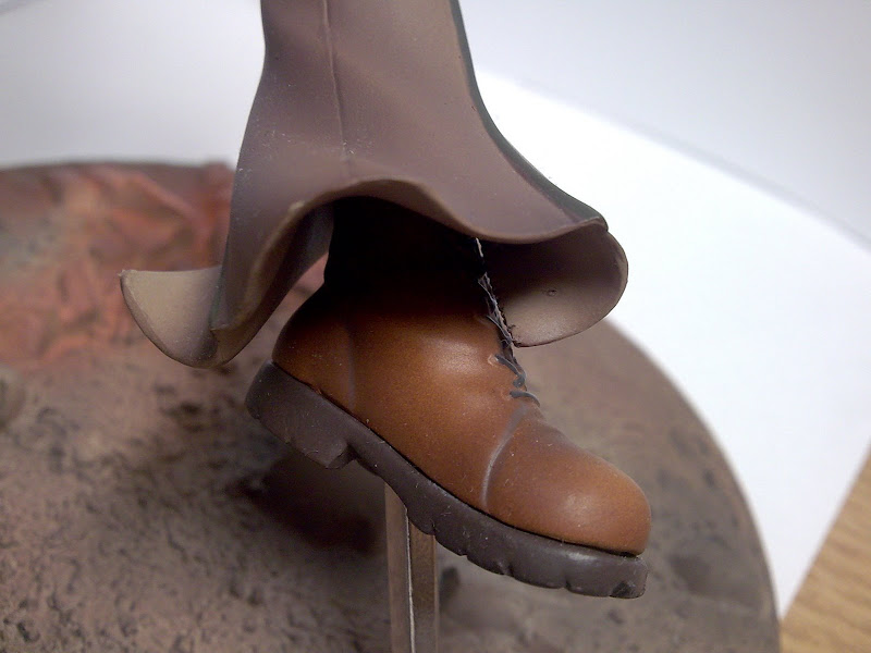 Now to the cape itself. It adds an extra element to the figurines dynamics and fills space to the left to make it less ‘empty’. The cape itself is rather plain but is masterfully coloured with darker browns between the folds. Being a large feature of the figurine, the shape is spot on. However, being full of twists and turns, the seams of plastic are pretty noticeable.