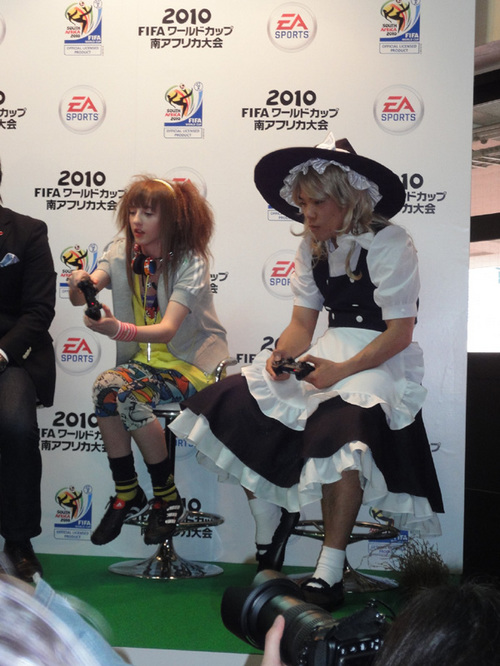 You get a press conference for EA Sports' FIFA soccer game.Yuichiro "Jienotsu" Nagashima, the cross-dressing kick boxer, showed up like he usually does — in a wig and wearing women's clothes. Hey, relax, he's cosplaying as witch character Marisa from the Touhou Project bullet hell shooter!
